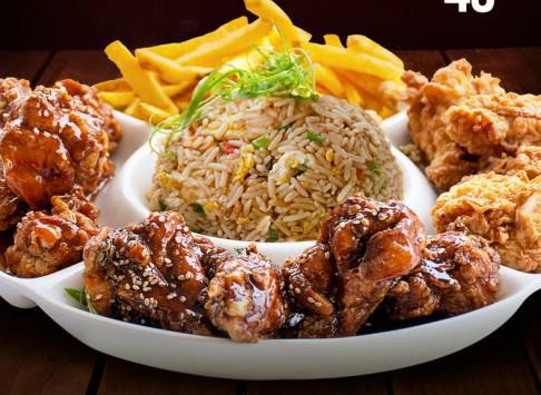Alitas de pollo con broaster o arroz chafa, cremas, papas y ensalada. (imagen referencial) 20-25min
