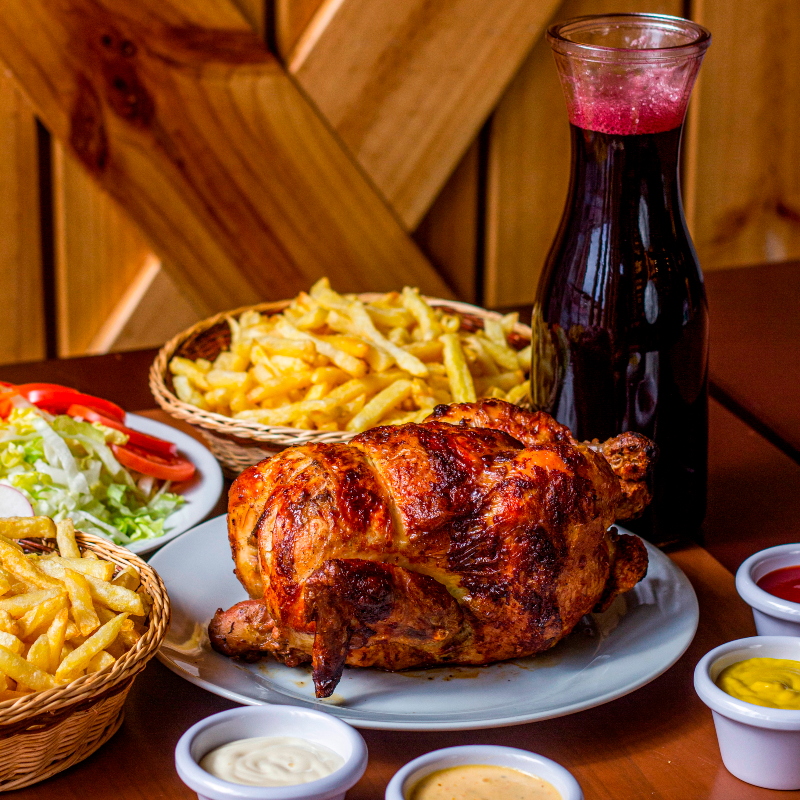 Todos las porciones de pollo a la brasa viene con papas fritas, cremas y ensalada. (imagen referencial) 20min
