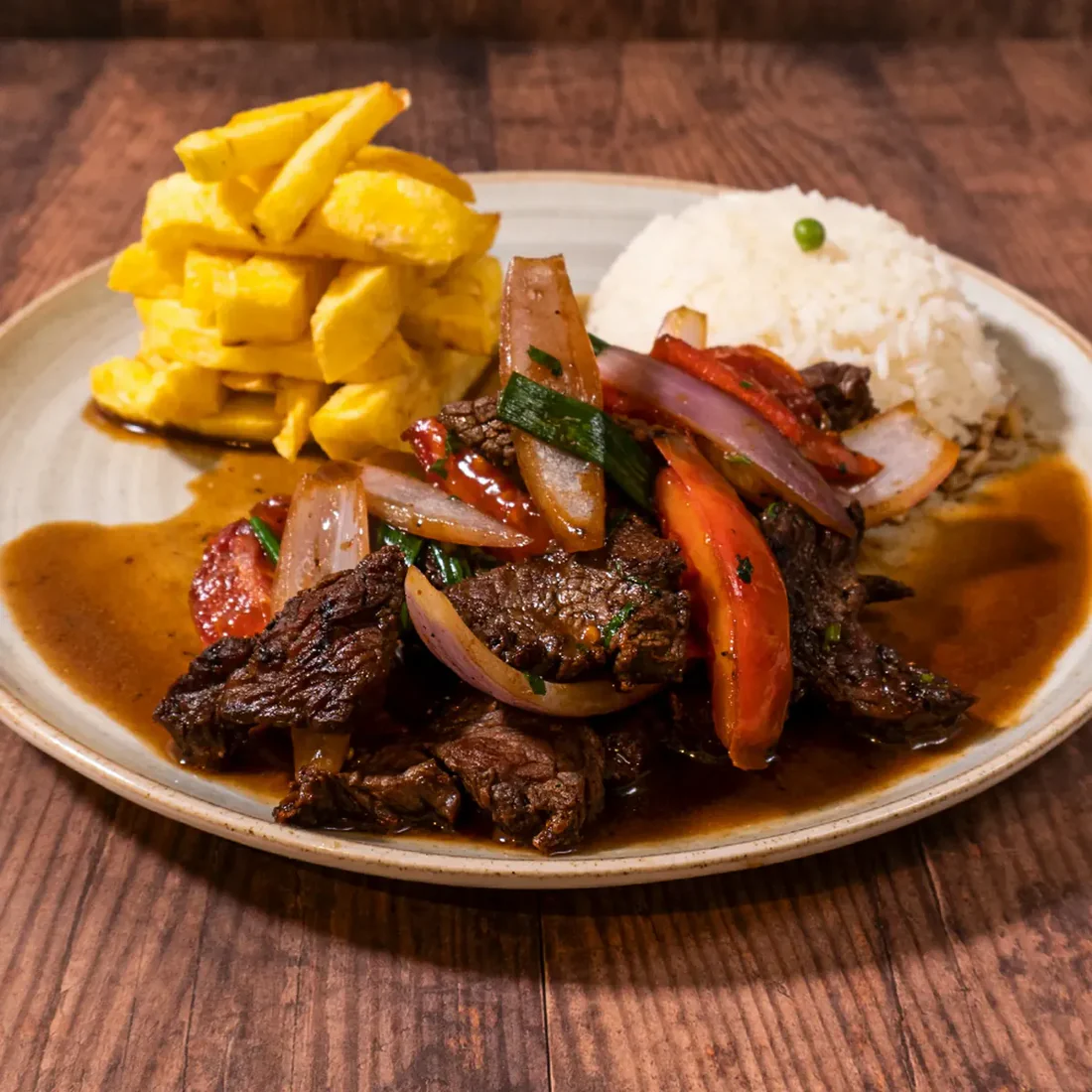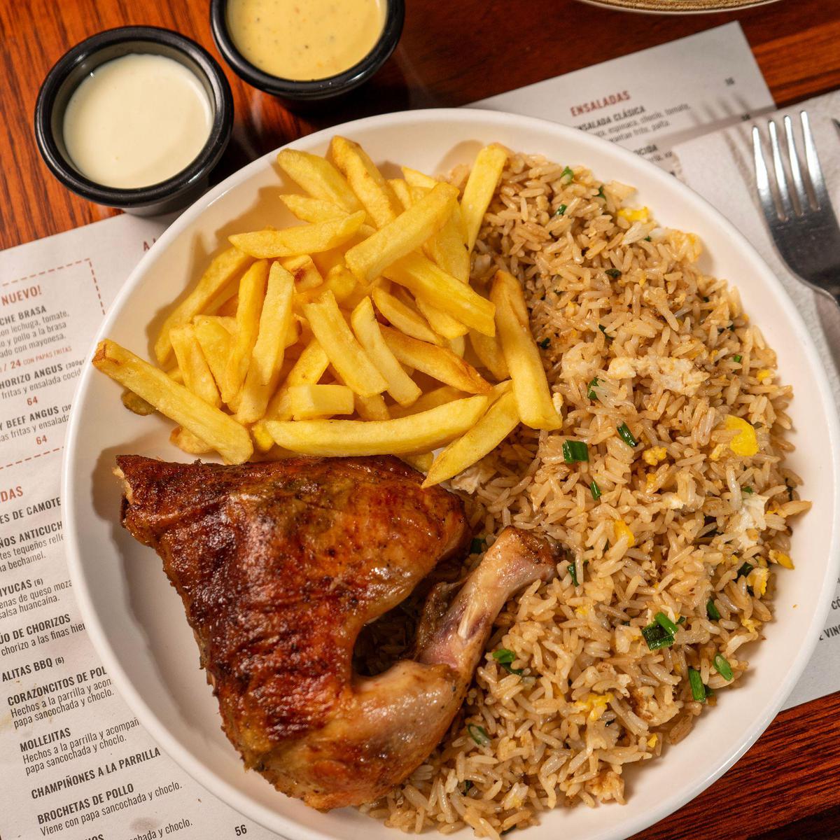 Pollos a la brasa con arroz chaufa, cremas y ensalada. (imagen referencial) 20-25min