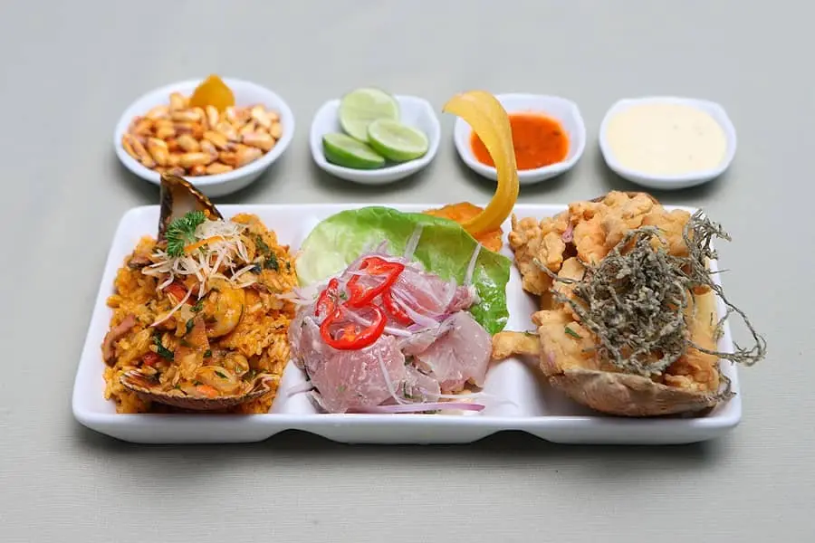 Una fuente con 3 potajes: Ceviche de pescado, Arroz con Mariscos y Chicharrón (imagen referencial) 20-30min