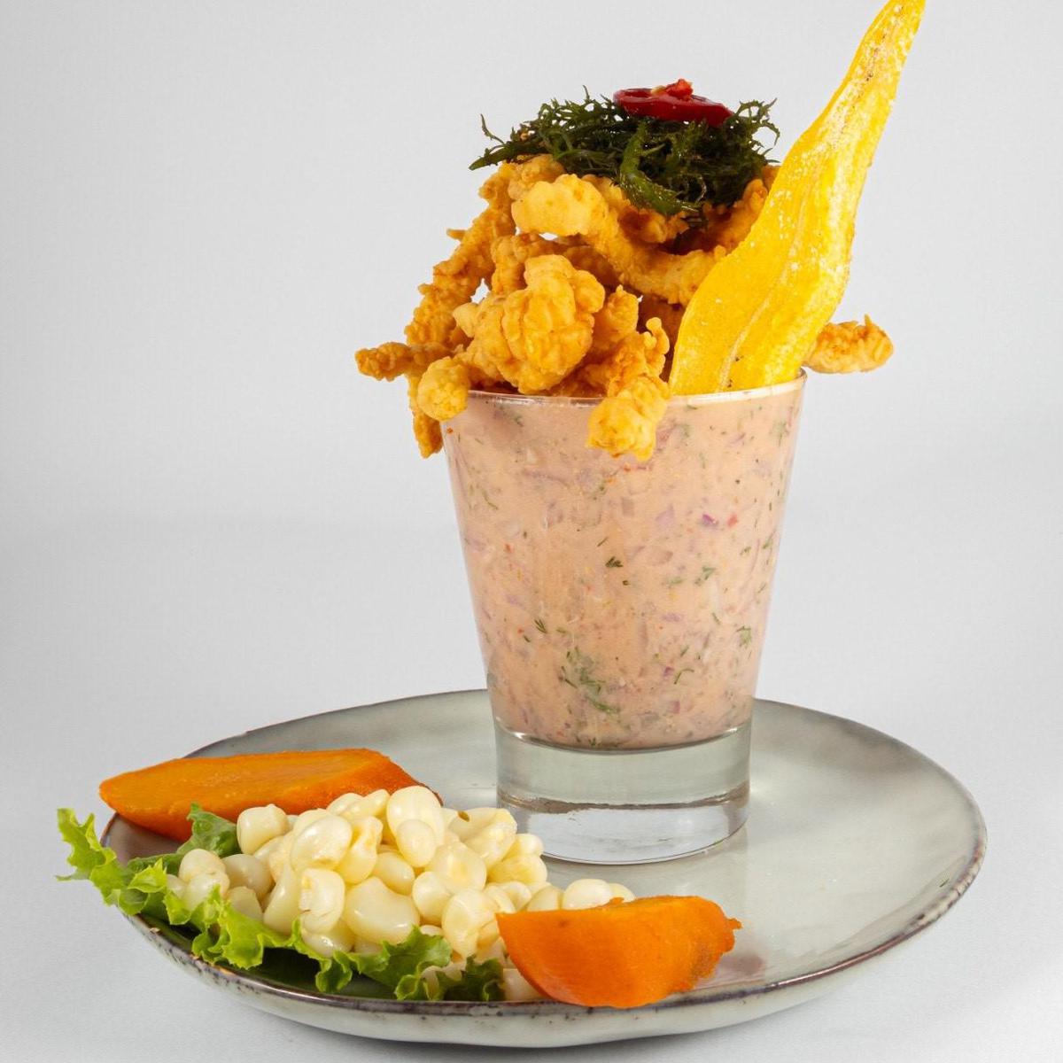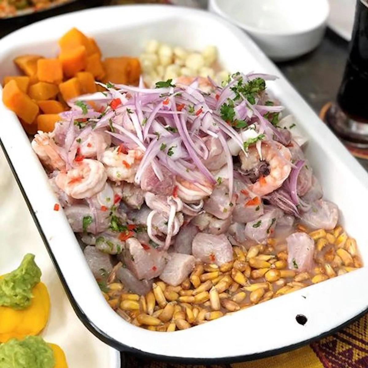 Un plato con dos potajes: Ceviche de Pescado + Chicharrón (imagen referencial) 20-25min